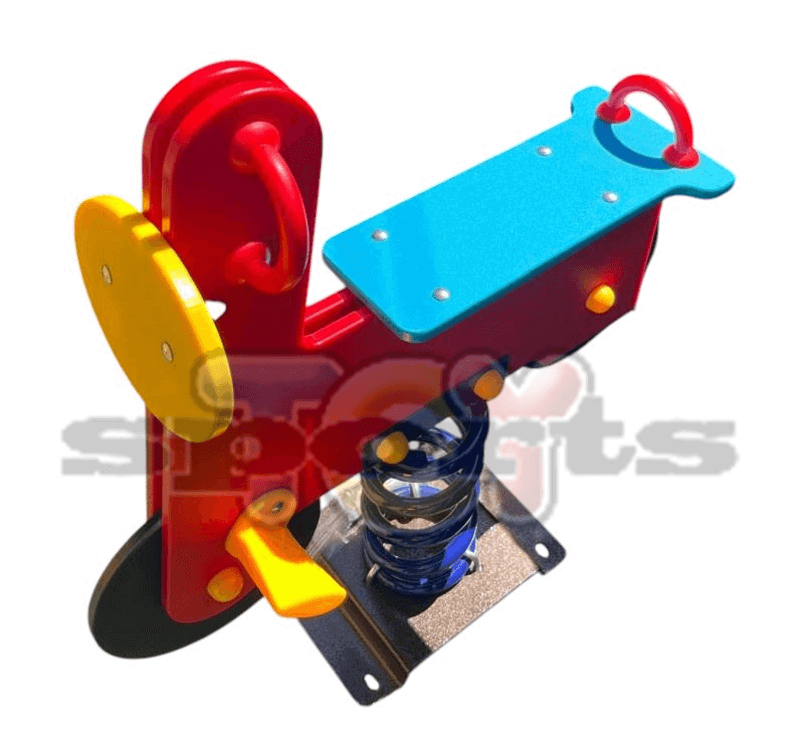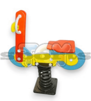Juego de resortes simple con forma de moto, destinado a la recreación infantil, fabricado con polietileno de alta calidad, lo que lo hace especialmente resistente a impactos y a las inclemencias del tiempo, contiene aditivos UV capaces de evitar la decoloración ante los rayos del sol, antiestáticos y no tóxicos.