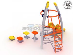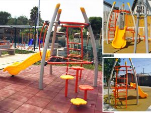Juego Modular de exterior, diseño multifuncional, cuya estructura es muy firme y segura que permite que varios niños jueguen de manera simultanea, constituido por una plataforma cuya estructura y uniones metálicas son de acero galvanizado, sellado al horno con pintura electrostática logrando un producto final hecho para durar.