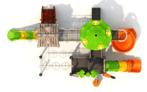 La tubería estructural de cada juego modular infantil plaza de exterior esta fabricada en acero galvanizado de Ø114 mm de diámetro y un espesor de capa de acero de 2,0 mm. La tubería secundaria presenta diámetros de entre Ø38 a 28 mm y espesor de 1,5 mm. Así también las plataformas y escaleras metálicas están especialmente acondicionadas con una baño de caucho antideslizante y de alto tráfico. El acabado de pintura de tubos, abrazaderas y otros accesorios tienen un tratamiento al horno, sellados electro estáticamente con aplicaciones de capas de polyester logrando un producto final que garantiza una larga vida útil bajo cualquier condición climática.